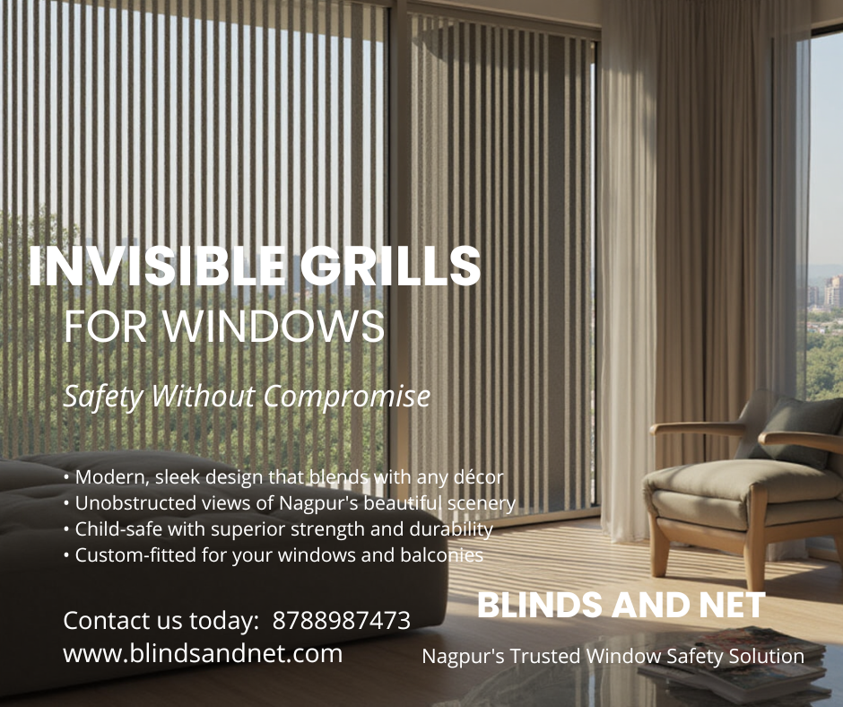 Blinds And Net offers high-quality Invisible Grill for Windows in Nagpur, providing a perfect combination of safety, modern design, and unobstructed views. Our invisible window grills are made from strong stainless steel cables that ensure protection without affecting the beauty of your home or office. Invisible grills are ideal for apartments, flats, bungalows, commercial buildings, hospitals, and high-rise buildings. They keep your family, children, and pets safe while maintaining proper ventilation and a clean, stylish look. Why Choose Invisible Window Grills? ✔ Child & Pet Safety ✔ Rust-Free Stainless Steel Cables ✔ Modern & Elegant Appearance ✔ Clear Outside View ✔ Strong & Durable Installation ✔ Low Maintenance ✔ Weather Resistant for Nagpur Climate ✔ Suitable for Flats, Homes & Offices Our Invisible Grill Services Include: Invisible grill installation for windows Safety grill for high-rise apartments Child safety invisible grill Pet safety window grills Custom size invisible grills Residential & commercial invisible grills Balcony & window invisible grill solutions Benefits of Invisible Grill for Windows Invisible grills provide maximum safety without blocking sunlight or airflow. They enhance the look of your interiors while offering strong protection against accidents and unauthorized access. Unlike traditional iron grills, invisible grills give your windows a premium and modern finish. Why Blinds And Net? Blinds And Net is a trusted name in Nagpur for invisible grill solutions. We use premium-quality materials, professional installation, and offer affordable pricing with long-lasting results. Our expert team ensures proper tension, neat finishing, and complete customer satisfaction. 📍 Service Area: Nagpur & Nearby Locations 📞 Contact Blinds And Net for the best invisible grill for windows in Nagpur
